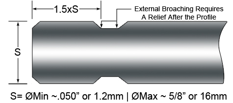 Broaching of External forms is also possible using the same concept as ID Broaching except it uses a precision cutter to shape the outside diameter of the part. This operation is ideal for parts that are identical for the entire circumference of the part. Also the part needs to have relatively loose tolerances as this operation is hard to keep tight. Creating parts such as gear teeth is not possible. Ideal parts for this application would be for example, faucet handles, automotive wiper blade axles, splines, hand grips on the OD of the part, and wrench flats. Typically tolerances can be held to within a .003-.005. Please call to discuss your application. |